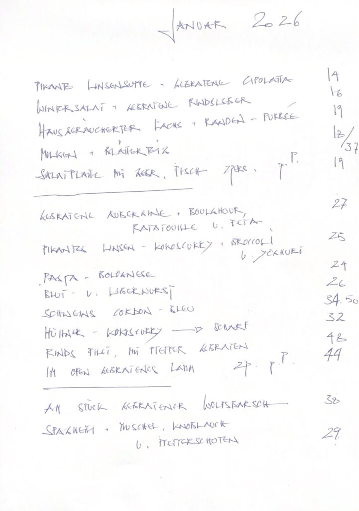 Wir kochen nicht auf Vorrat, Frische und Saisonalität sind uns wichtig. Daher sind diese Karten nicht immer verbindlich: Mal ist etwas ausgegangen oder etwas anderes dafür ganz frisch angekommen.